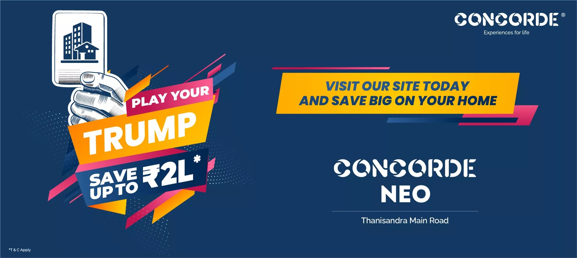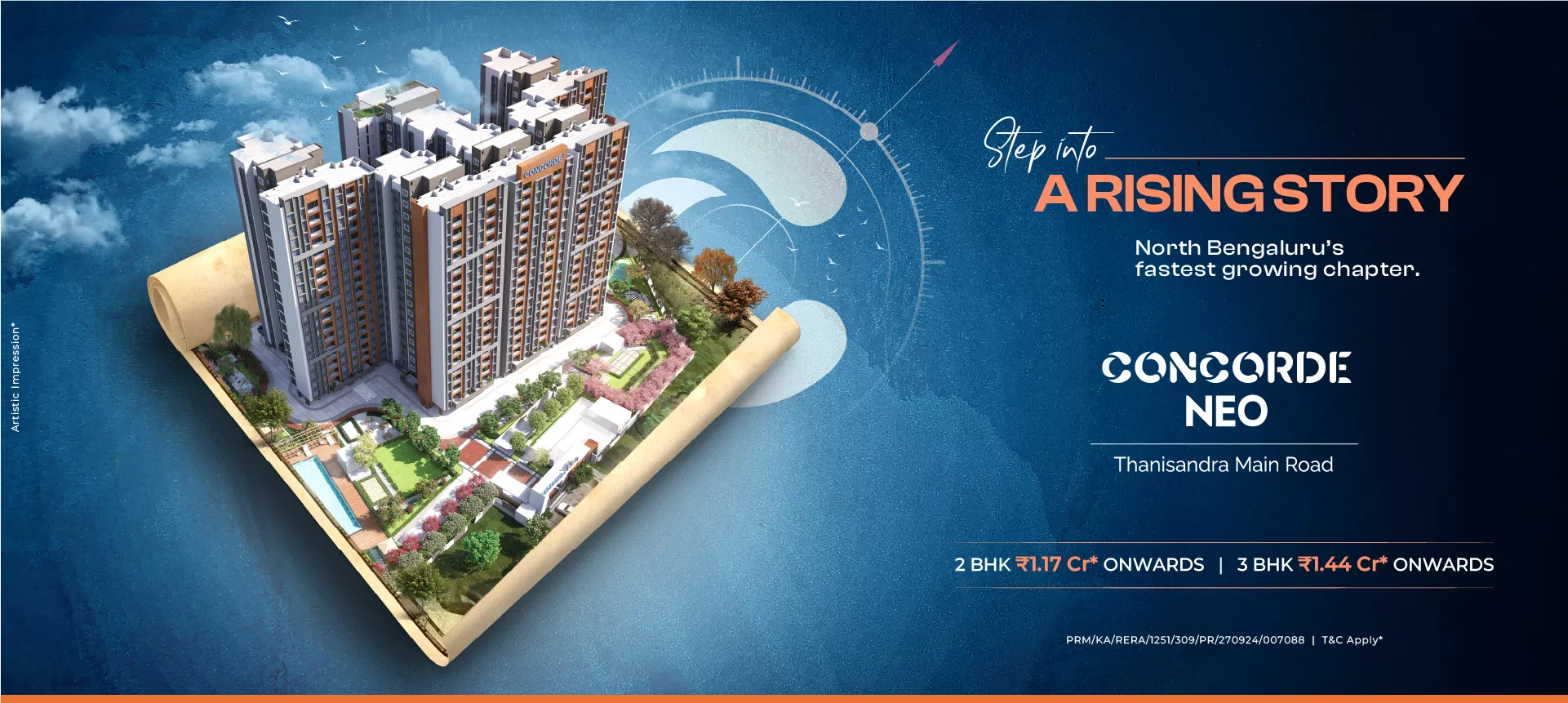Welcome to Concorde Neo, nestled in the thriving hub of Northeast Bengaluru on Thanisandra Main Road. Designed for those who seek a balance of modernity and exclusivity, Neo offers premium 2 & 3 bed homes within a limited community. Here, elegance is redefined with thoughtfully crafted amenities, including a sky-level multi-tier clubhouse. At Concorde Neo, live at the crossroads of opportunities and indulgences.